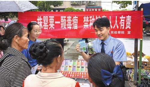 9月25日,贵州省锦屏县检察院干警来到该县敦寨镇中心集市开展“禁种毒品原植物”主题宣传活动。检察干警手持罂粟、大麻等毒品原植物模型、毒品成品模型,通俗易懂地讲清毒苗外形特征和法律危害,吸引不少来往群众驻足聆听。