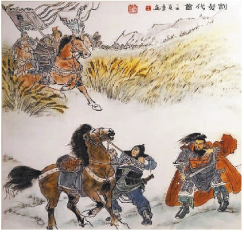 曹操“割发代首”是《三国演义》中的一个著名故事。说的是有一次曹操率领军队途经大片麦田,为了不损害庄稼,他下了这样一道命令:“吾奉天子明诏,出兵讨逆,与民除害。方今麦熟之时,不得已而起兵,大小将校,凡过麦田,但有践踏者,并皆斩首。军法甚严,尔民勿得惊疑。”(《三国演义》第十七回)然而事与愿违,非常不巧,曹操骑马行进时,“忽田中惊起一鸠。那马眼生,窜入麦中,践坏了一大块麦田”。怎么办呢?面对自己违令的局面,书中写道:“操随呼行军主簿,拟议自己践麦之罪。主簿曰:‘丞相岂可议罪?’操曰:‘吾自制法,吾自犯之,何以服众?’即掣所佩之剑欲自刎。众急救住。郭嘉曰:‘古者《春秋》之义:法不加于尊。丞相总统大军,岂可自戕?’操沉吟良久,乃曰:‘既《春秋》有法不加于尊之义,吾姑免死。’乃以剑割自己之发,掷于地曰:‘割发权代首。’使人以发传示三军曰:‘丞相践麦,本当斩首号令,今割发以代。’于是三军悚然,无不懔遵军令。”这就是故事的经过,后世对这一情节的解读多有分歧,有人将此作为曹操狡猾的例证,说“拔刀割发权为首,方见曹瞒诈术深”。也有人说,其实割发也是一种刑罚,类似“髡刑”,象征对受刑者人格与身份的惩戒。