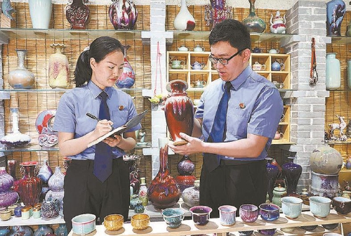 近日,河南省禹州市检察院开展“检护万彩”钧瓷文化检察综合保护工作。图为该院干警在钧瓷商户就钧瓷地理标志专用标志规范使用情况进行调研。