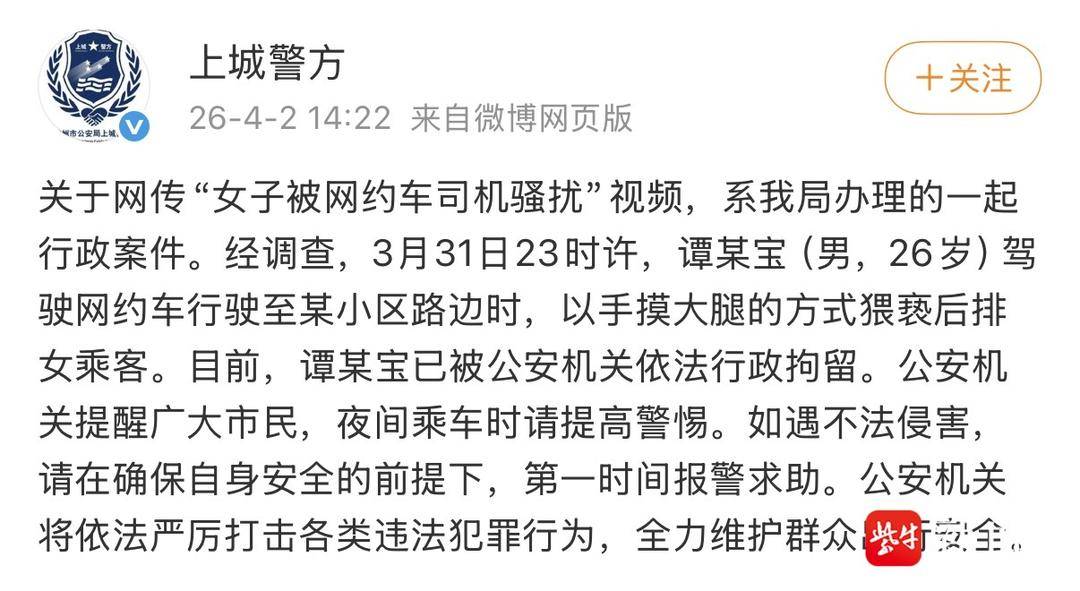 4月2日,扬子晚报/紫牛新闻记者注意到,杭州市公安局上城分局就此事发布警情通报:“关于网传‘女子被网约车司机骚扰’视频,系我局办理的一起行政案件。经调查,3月31日23时许,谭某宝(男,26岁)驾驶网约车行驶至某小区路边时,以手摸大腿的方式猥亵后排女乘客。目前,谭某宝已被公安机关依法行政拘留。”