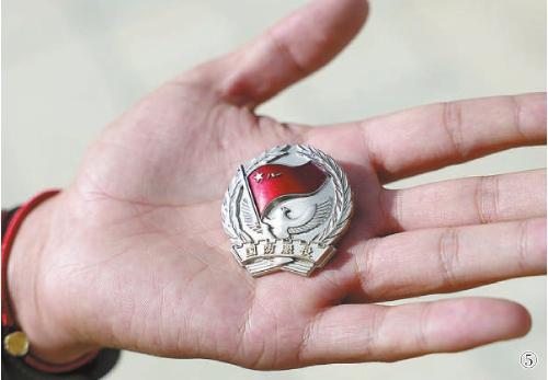 图⑤:一位刚退役的军人自驾进藏途中特意绕道康西瓦,将自己唯一的一枚“国防服役”徽章放在烈士墓前。图为军人向记者展示徽章。