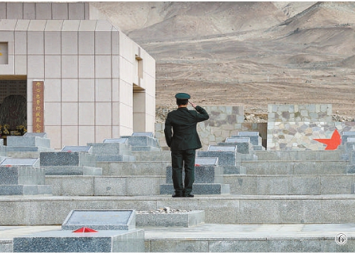 图⑥:一位军人在烈士陵园悼念戍边烈士。