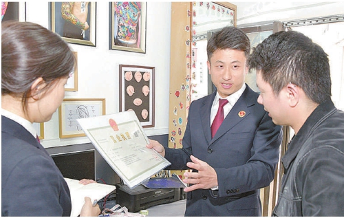 唐焕然(中)与同事在文身服务经营店回访。 本报通讯员江泳摄
