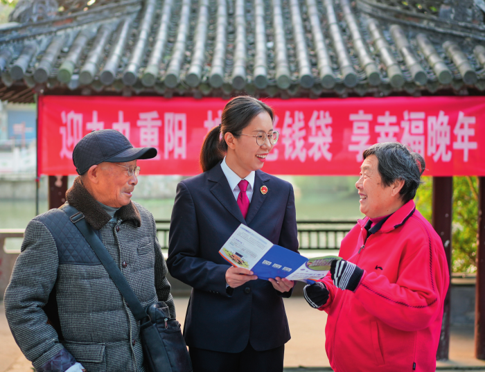 江苏省兴化市人民检察院法治宣讲团的工作人员在公园为老年人讲解有关养老法律知识(2025年10月27日摄) 新华社发(周社根摄)